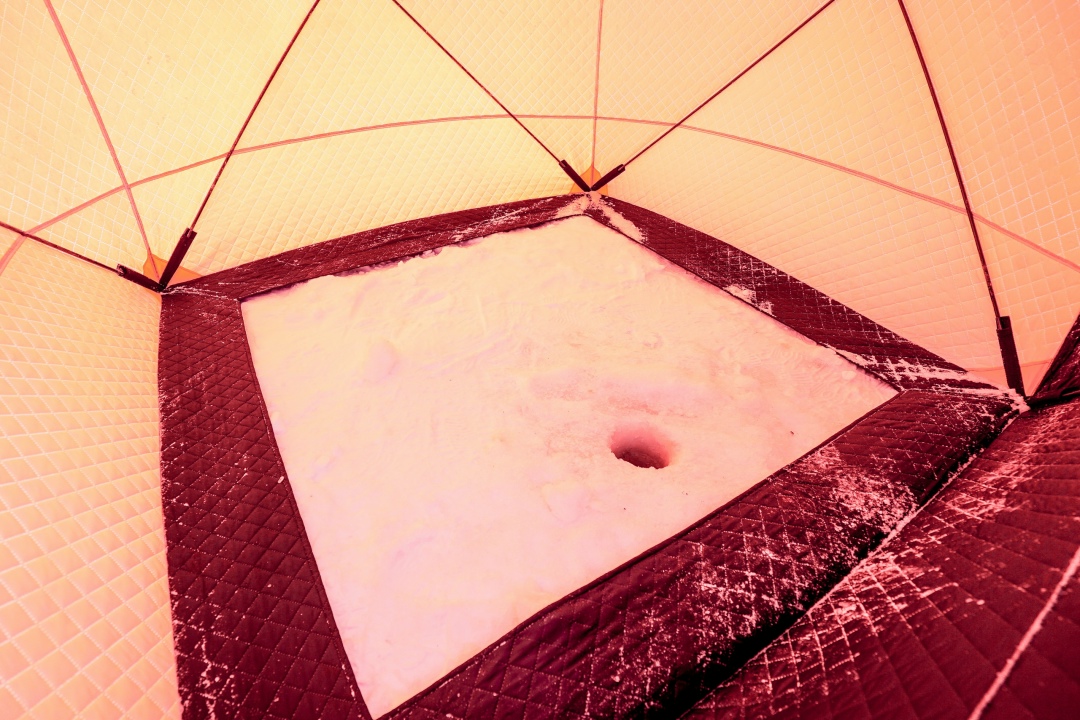Для комфортной рыбалки в тепле, не обязательно делать отверстие для лунки в полу. Можно убрать один элемент пола на время рыбалки. А на ночное время вернуть элемент на место. Таким образом, пол останется сухим, и для рыбалки нет необходимости выходить в мороз.